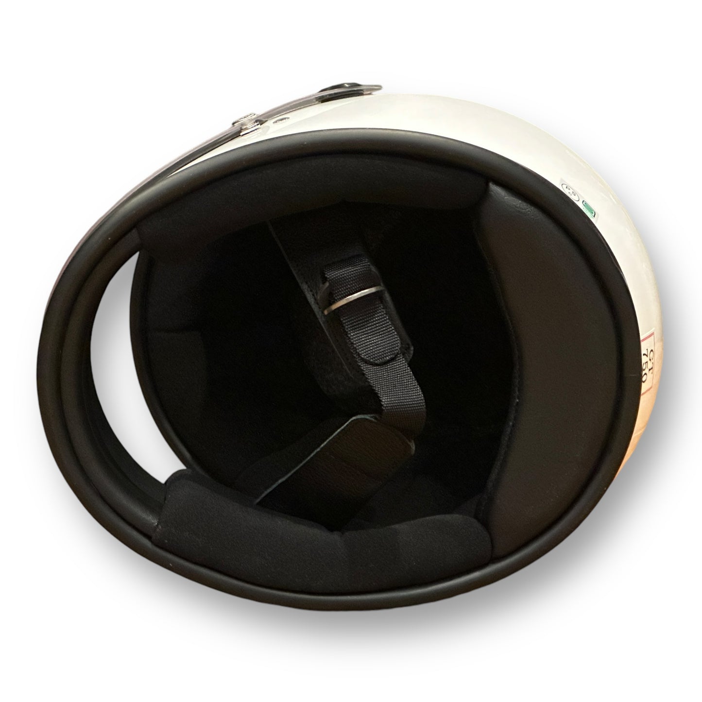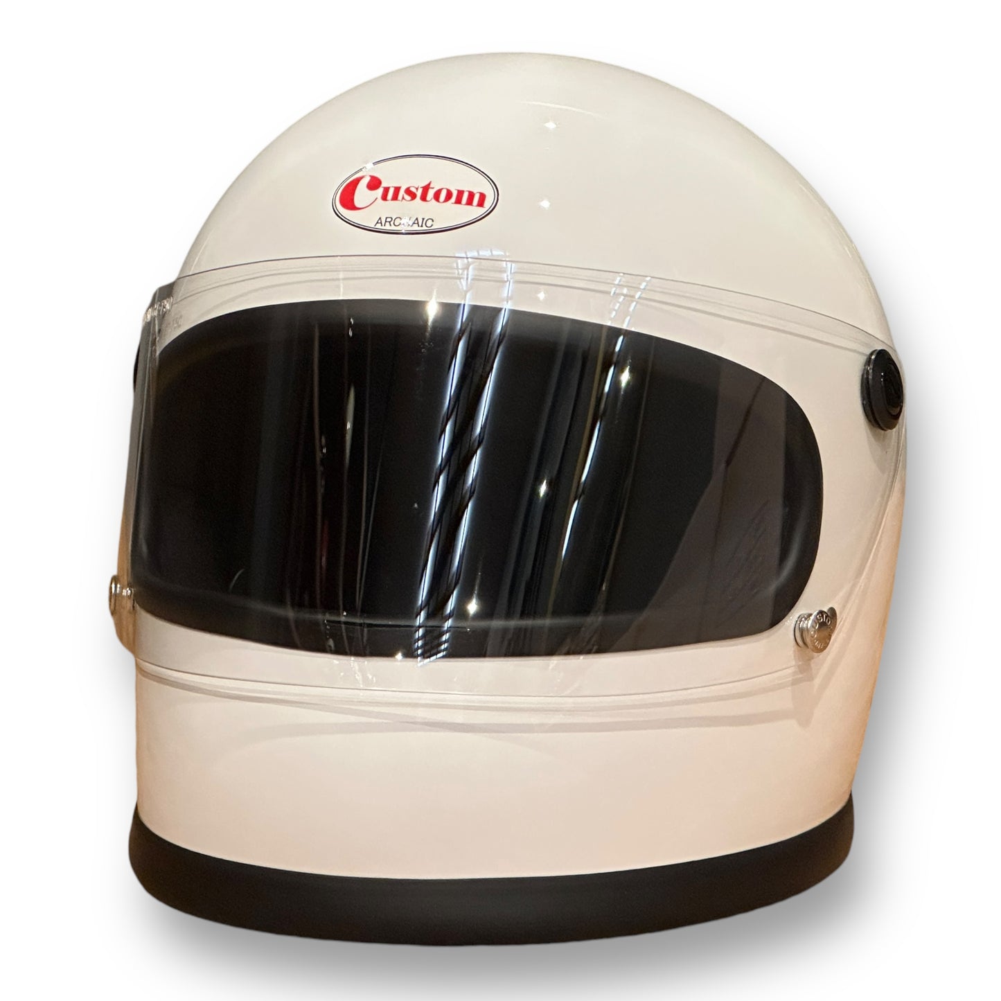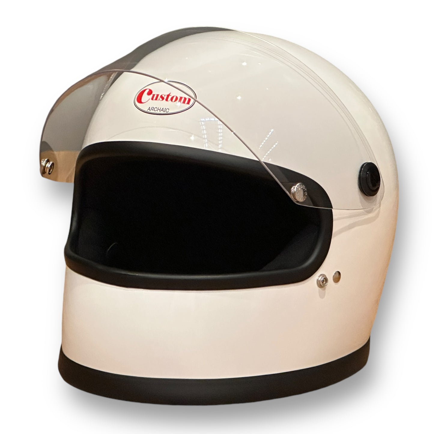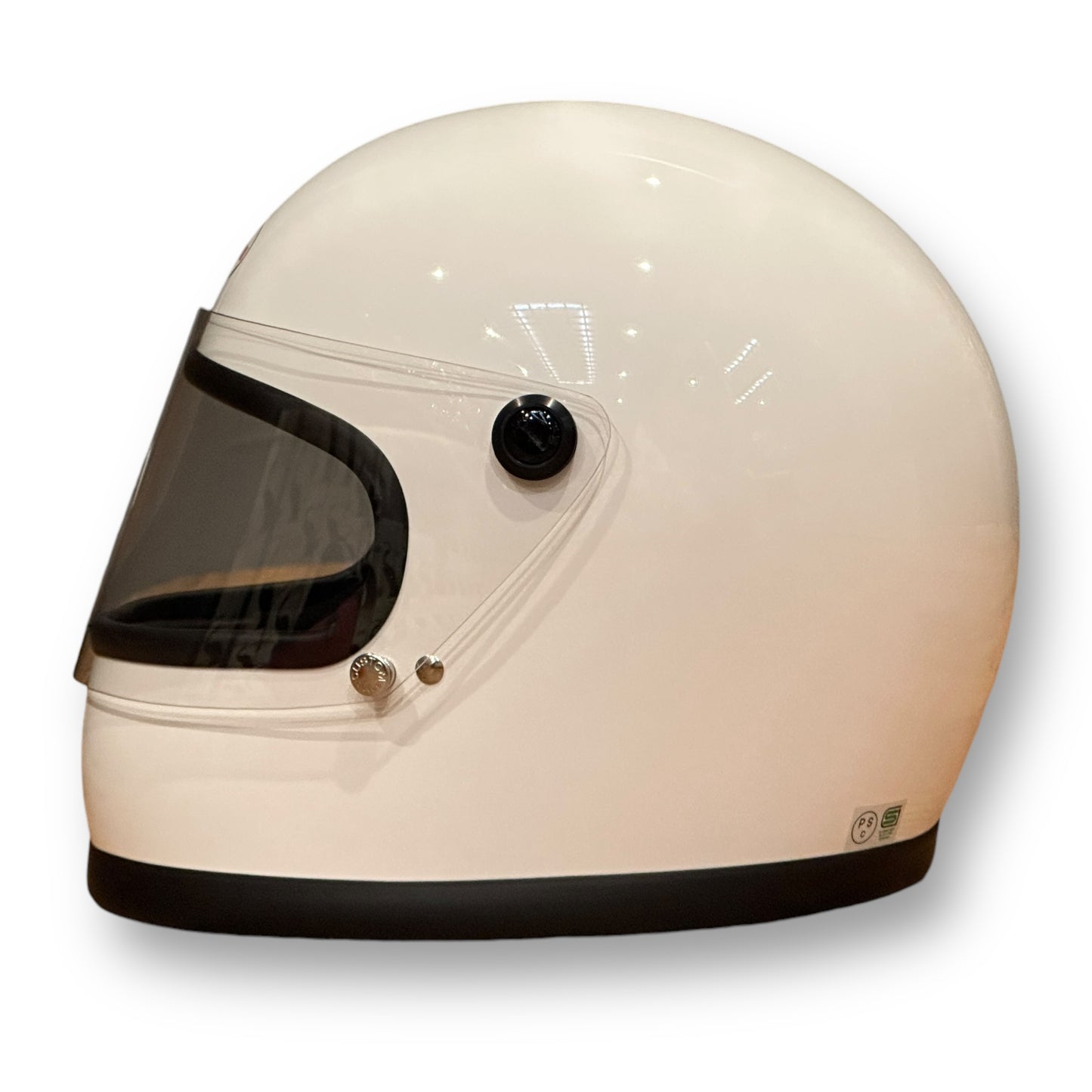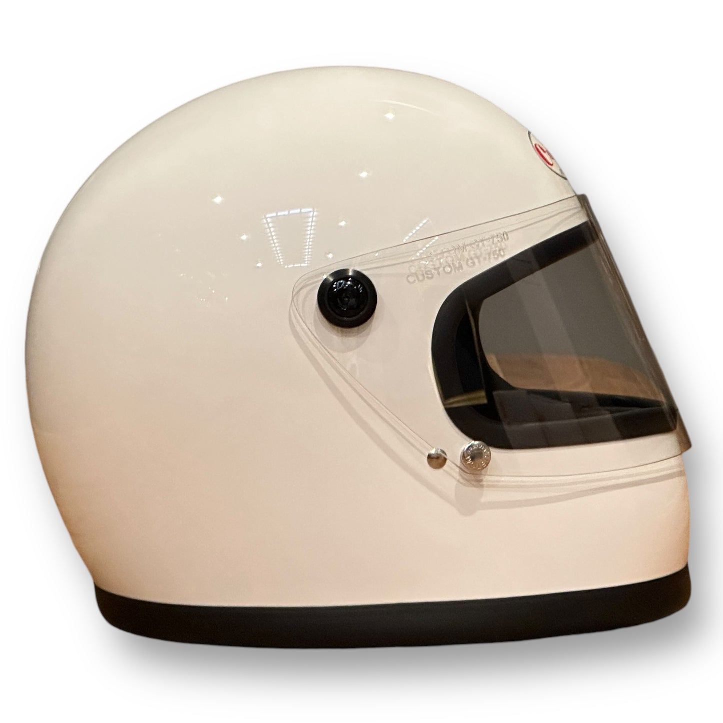視界部分の高さはセンターで約80㎜。ライディングに支障がない範囲を保ちつつ、見た目の良さを重視している。シールド面とスナップボタンには当時と同じ書体で同じ文字で刻印が入る。
